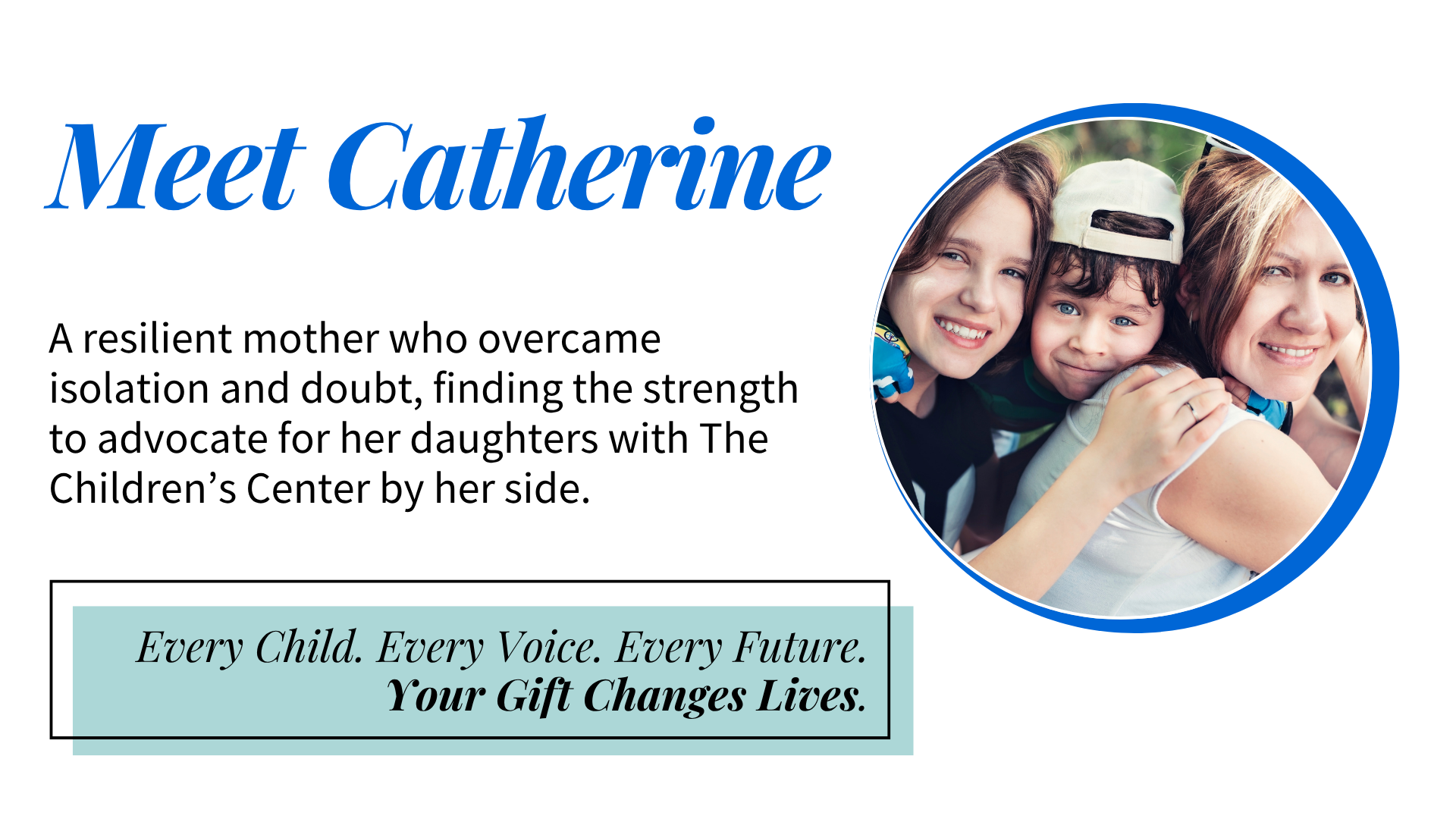 A mother’s worst fears came true when both of her daughters faced life-altering crises—one struggling with depression and suicidal thoughts, the other diagnosed with multiple mental health and learning challenges. Overwhelmed and lost, Catherine turned to The Children’s Center for help. With the support of a dedicated Parent Support Specialist, she found hope, learned to advocate for her children, and transformed her family’s future.