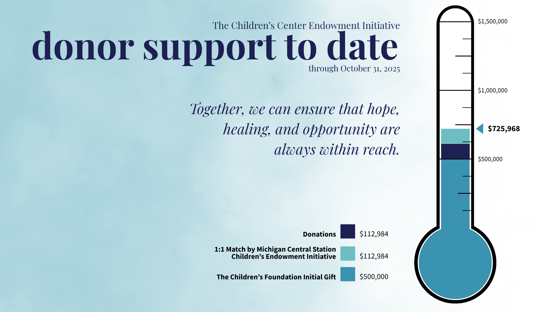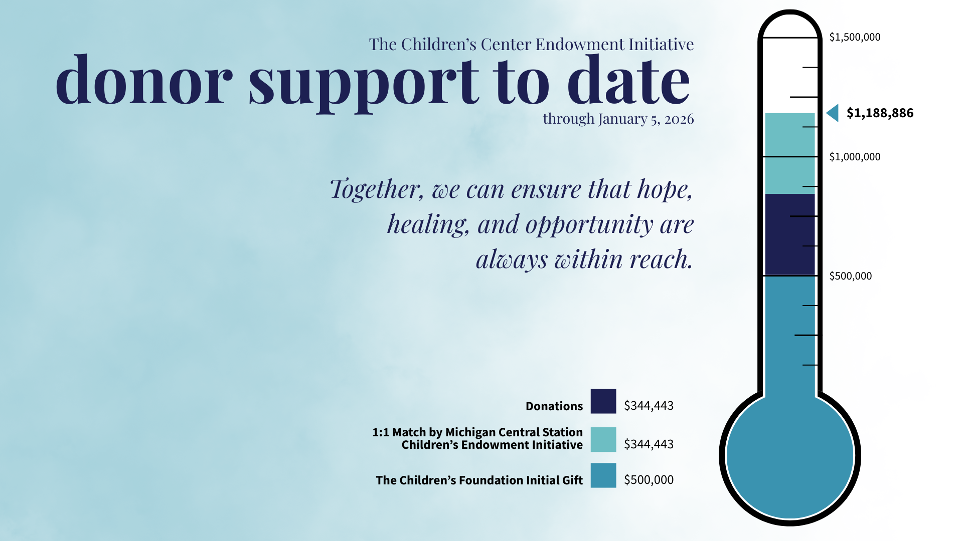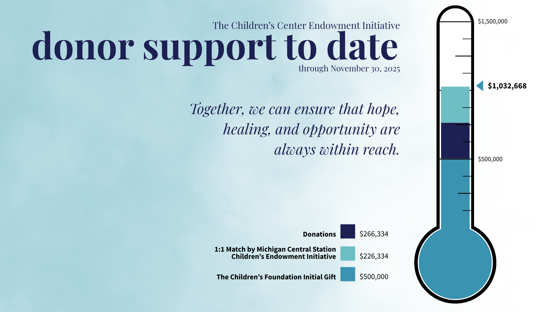 Thanks to the Michigan Central Station Children’s Endowment Initiative, we’ve already received $500,000! Now, every dollar raised will be matched, up to another $500,000, through 2026. Together, we can build a $1.5 million endowment that ensures children always have access to the care and support they need.