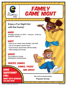 Enjoy a Fun Night Out with the Family! When Tuesday, October 18, 2016 • 4:00 p.m. - 6:00 p.m. No RSVP required. What Open to our clients, their families, and staff Lots of fun games and free food A great way to spend time with the family while making new friends Where The Children’s Center, […]